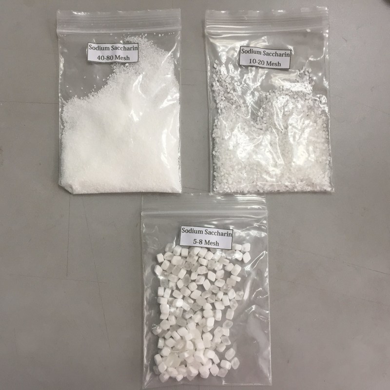 Η σακχαρίνη του νατρίου έχει σχήμα ρομβού και είναι ομοιογενής, λευκή και φωτεινή.Η γλυκύτητα αυτού του προϊόντος μπορεί να είναι 450-500 φορές μεγαλύτερη από αυτή της σακχαρόζηςΤα καταναλωτικά προϊόντα παρέχονται σε ένα ευρύ φάσμα μεγέθους κρυστάλλων: 4-6 mesh, 5-8 mesh, 8-12 mesh.10 - 20 δίχτυα20-40 ματιών, 80-100 ματιών.